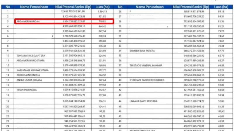 Data yang dihimpun menyebutkan, atas dugaan perambahan tersebut, PT AMI terancam dikenai sanksi administratif sebesar Rp6.924.733.882.325,07 atau lebih dari Rp6,9 triliun. Nilai tersebut merupakan hasil perhitungan kewajiban Penerimaan Negara Bukan Pajak (PNBP) sektor kehutanan sesuai regulasi yang berlaku.