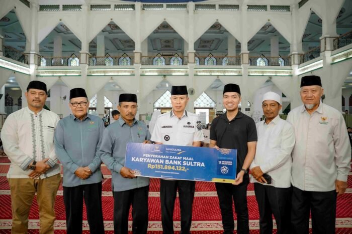 KENDARI, NUSANTARAVOICE.COM– Bank Sultra kembali menunjukkan komitmen sosialnya melalui penyaluran zakat maal karyawan. Bertempat di Masjid Agung Al-Kautsar Kendari pada Rabu (18/03/2026), Bank Sultra menyerahkan zakat maal senilai Rp151.894.122,- melalui Badan Amil Zakat Nasional (BAZNAS) Provinsi Sulawesi Tenggara.