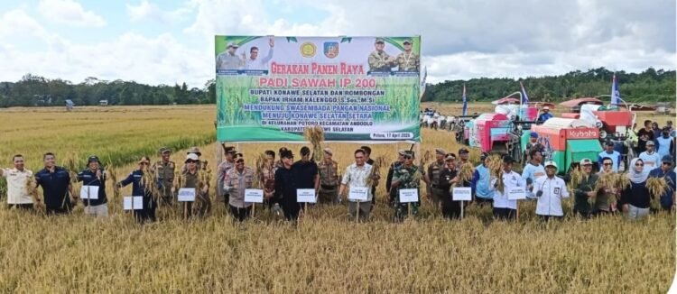 ANDOOLO, NUSANTARAVOICE.COM — Pemerintah Provinsi Sulawesi Tenggara terus mengakselerasi penguatan ketahanan pangan melalui peningkatan indeks pertanaman (IP). Salah satunya ditunjukkan lewat pelaksanaan Gerakan Panen Raya IP 200 yang berlangsung di Kelurahan Potoro, Kecamatan Andoolo, Kabupaten Konawe Selatan, Jumat (17/4/2026).